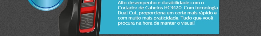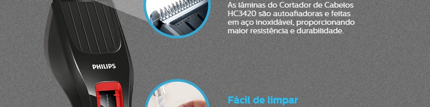 O desempenho do Philips HC3420/15 é excelente. Com uma unidade de corte duplamente afiada e a tecnologia DualCut, o aparelho apresenta resultados duas vezes mais rápidos em relação a outros modelos da Philips. As lâminas são auto afiadas e fabricadas em aço.