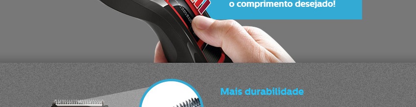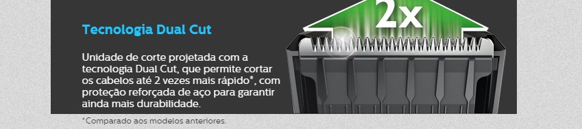 O aparelho traz lâminas de aço auto afiadas de longa duração e executa cortes até duas vezes mais rapidamente graças à tecnologia DualCut. Para mais liberdade, a bateria em carga completa tem autonomia de aproximadamente 60 minutos de uso.