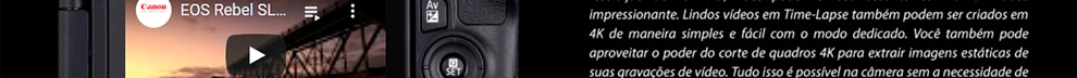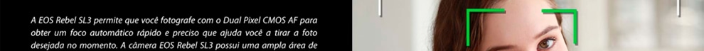 A Câmera Digital Canon EOS Rebel SL3 DSLR com lente EF-S 18-55mm IS STM é sua melhor aliada para capturar momentos incríveis. Esta câmera Canon permite a gravação de vídeos em 4K, vem equipada com a tecnologia de foco Dual Pixel AF e tela LCD Touchscreen de 3.0 polegadas com ângulo variável para gravar vídeos, tirar selfies e fotografias em ângulos inusitados.