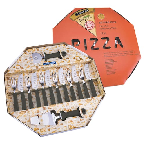 O Conjunto para Pizza Tramontina Preto serve até 6 pessoas e acompanha um cortador e espátula para servir que lâmina em aço inox, com maior durabilidade e cabo com detalhe de apoio, proporcionando maior firmeza e segurança no manuseio. Um conjunto com peças em cores alegres e diferenciadas. Além disso, vem em uma moderna embalagem em formato de pizza.