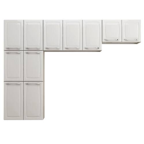 Essa cozinha é formada por 3 peças, sendo: Paneleiro Max com 70 cm de largura, o Armário Max 3 portas de 105cm e o Armário 2 portas de 70cm, que oferecem local para acomodar cuidadosamente suas panelas, formas, pratos, copos e acessórios decorativos.