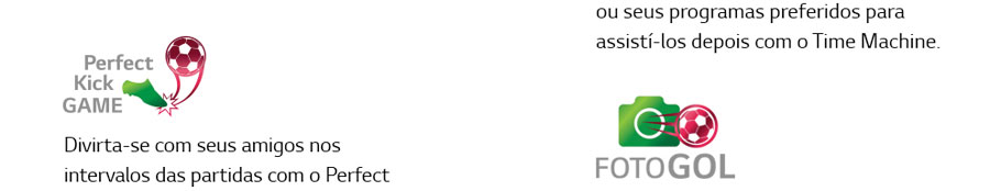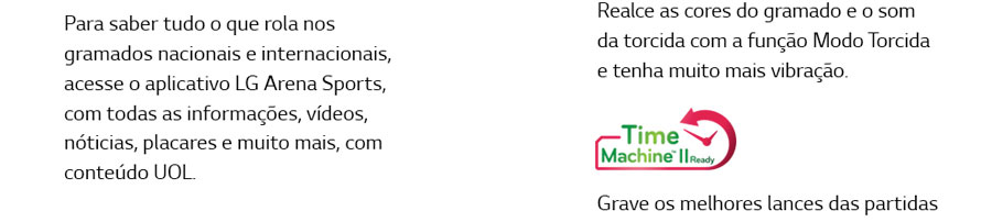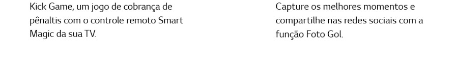 O Dual Play é um recurso que necessita de óculos especiais, vendidos separadamente. Entretanto, ao usá-lo, ele é capaz de dividir a tela do televisor em duas para que não haja discordância entre as pessoas. Já o Modo Torcida aumenta a sua paixão pelo futebol. Sinta-se em qualquer estádio do mundo com essa função que realça a imagem do gramado e dos uniformes e amplia a qualidade do som.