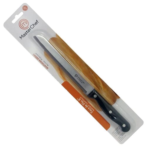 Faca Para Pão 8 Quotidien Series Forjada Masterchef A faca para pão 8 Quotidien Series Forjada MasterChef é uma faca forjada, ou seja, feita em perfil integral full tang , garantindo durabilidade e resistência. Sua lâmina longa e serrilhada permite o corte sem machucar o pão. Serve também para o corte de alimentos duros como amêndoas, chocolates e também alimentos mais macios como bolos e tomates. A faca é embalada em blister, garantindo higiene no processo de estocagem, embalagem e envio. Siga as instruções da embalagem para sua manutenção e conservação. Composição: Aço inox, pp Medidas: Comprimento: 31,5 cm Largura: 2,5 cm Peso: 90 gramas Ean: 7897185977615