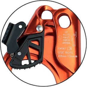 Blocante para progressão em corda, confeccionado em chapa de alumínio de alta resistência, com tratamento anodizado, dotado de sistema de engate rápido e empunhadura ergonômica, possui espaço para fixação de mosquetão para fixação do estribo, sistema de bloqueio anti-derrapante. Disponível em dois modelos, mão direita azul ou mão esquerda laranja. É vendido por unidade, sendo que o cliente escolhe se deseja a mão direita ou a mão esquerda do ascensor de punho.