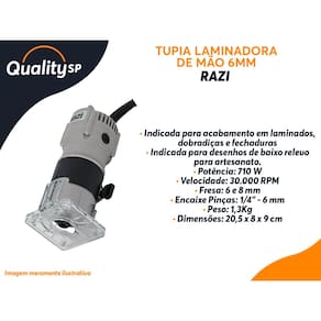 A Tupia Laminadora de Mão 6mm 127V é uma ferramenta elétrica compacta e potente, ideal para profissionais e entusiastas da marcenaria e do artesanato. Com uma potência de 710 W e uma velocidade de até 30.000 RPM, ela é projetada para proporcionar acabamentos precisos em laminados, dobradiças, fechaduras e outros detalhes finos em madeira e materiais similares. Seu design ergonômico e peso de apenas 1,3 kg oferecem fácil manuseio e controle, tornando-a perfeita para criar desenhos de baixo relevo e acabamentos delicados em projetos de artesanato. Com encaixes para fresas de 6 mm e 8 mm, e um sistema de pinças de 1/4" – 6 mm, esta tupia laminadora é a escolha certa para quem busca qualidade, versatilidade e agilidade em suas tarefas de acabamento e usinagem.