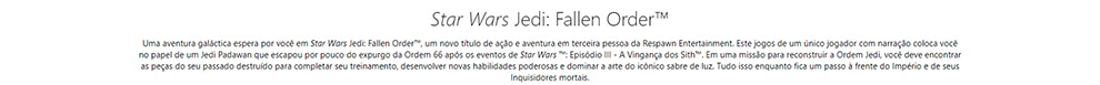 ,br> No jogo Star Wars Jedi: Fallen Order Deluxe Edition você irá se deparar com uma galáxia recentemente dominada pelo império, precisando reconstruir a Ordem Jedi logo após os eventos de Star Wars: Episódio III - A Vingança dos Sith, na qual você é um Jedi Padawan que por pouco conseguiu escapar do expurgo da Ordem 66.
