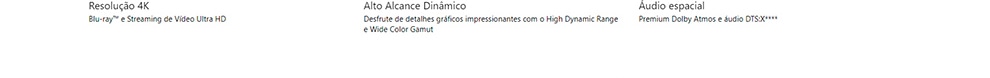 Reprodução de Streaming e Blu-ray em 4K, otimizando a imersão em seu tipo de entretenimento favorito, em conjunto com os áudios espaciais muito mais realistas devidos ao Premium Dolby Atmos e ao DTS:X. Para enriquecer ainda mais a qualidade da sua experiência, ele vem com a tecnologia de alto alcance dinâmico HDR que revela a verdadeira profundidade visual dos jogos e filmes compatíveis, através de um maior contraste entre claro e escuro e cores mais ricas e luminosas, permitindo com que você desfrute de cenários deslumbrantes, como nunca se viu antes.
