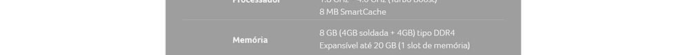 Expansível até 20 GB (1 slot de memória livre)