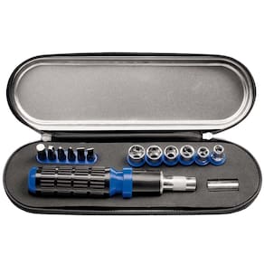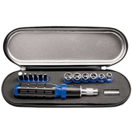 Vêm com peças fundamentais como: chave com enxaixe para adaptar ponteiras ou soquetes, adaptador para soquetes 1/4", soquetes sextavados 1/4" em aço carbono, ponteiras cruzadas em aço especial, ponteiras chatas em aço especial, extensão para ponteiras e estojo de metal com zíper e berço em EVA.