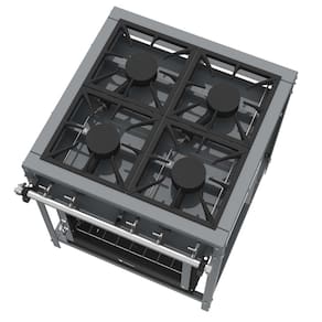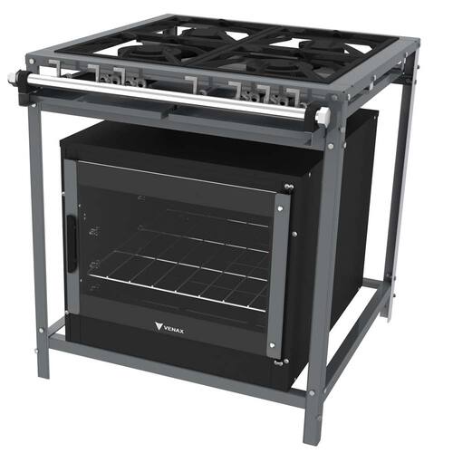 Além disso, conta com um puxador ergonômico, travamento mecânico, 1 prateleira removível, além de 2 queimadores dianteiros com dupla chama diâmetro 150 mm e dois traseiros, bem como bandejas coletoras, mesa em aço carbono em formato de U e registro à gás com manípulos expostos e de fácil manuseio.