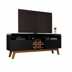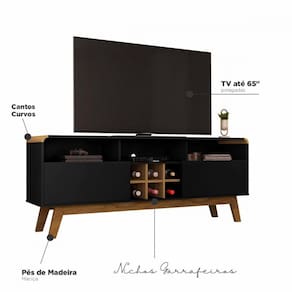 Características: Para TV até 65 polegadas Estrutura em MDP de 15 e 12mm Cantos Curvos Acabamento Semi Brilho Nichos Decorativos: 4 Pés Fixos em Madeira Maciça Dobradiças Metálicas Suporta até 55 kg