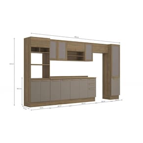 Medida de cada item (A x L x P): Aéreo: 70cm x 120cm x 34cm, Aéreo: 70cm x 80cm x 34cm, Aéreo: 35cm x 90cm x 34cm/ Balcão: 88cm x 80cm x 52cm/ Balcão: 88cm x 120cm x 52cm/ Kit Forno: 222cm x 70cm x 52cm/ Paneleiro: 222cm x 50cm x 52cm/ Tampo: 2,5cm x 80cm x 52cm/ Tampo: 2,5cm x 120cm x 52cm