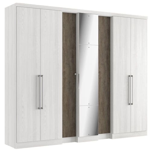 Já imaginou um móvel perfeito para deixar tudo organizado em seu quarto? Com o Roupeiro Selecto, agora na versão Glass você não terá mais preocupações com a bagunça! Produzido com estrutura e portas em MDP, ele possui 2 colunas de prateleiras e 4 gavetas para acomodar as suas roupas, calçados e acessórios. Além de 03 cabideiros e um ótimo espaço no maleiro. Seu lindo modelo com o acabamento Teka Sensitive, acompanhado do incrível BP Madeira Demolição proporciona uma decoração clássica e leve ao  ambiente. Tudo isso com o toque final dos puxadores longos em alumínio e de amplo espelho na porta central. Características Técnicas: Número de Portas: 7 portas de 15mm Dobradiças: metálicas Número de gavetas: 4 gavetas externas com sistema de corrediças metálicas Prateleiras: 5 prateleiras removíveis e 10 tampos fixos Puxadores: 4 puxadores de 512mm em alumínio com ponteiras em PVC cromado, 2 puxadores ponto em ABS (Termoplástico de alta resistência com verniz protetor UV) e 01 puxador perfil de 266mm em alumínio. Pés: 12 sapatas deslizantes em PVC Sapateira: Espaço para sapatos embaixo das gavetas Cabideiros: 3 cabideiros em alumínio/metálico Maleiros: 5 maleiros embutidos Acessórios de Montagem: Sistema de montagem com minifix e parafusos Dimensões do Produto: Altura: 233 cm Largura: 266 cm Profundidade: 55 m Peso: 216 Kg Garantia do Fornecedor de: 6 meses