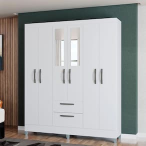 Características: Fabricado em MDP - 12 mm 6 Portas com Dobradiças Metálicas 2 Gavetas com Corrediças Metálicas 2 Espelhos 3 mm 2 Cabideiro de madeira Puxadores de Plástico Pés de Plástico Acabamento em Pintura U.V
