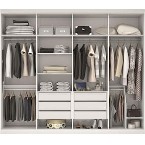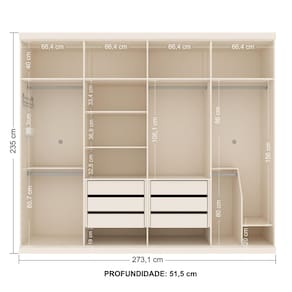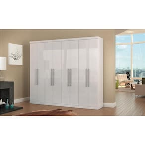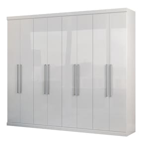 Estruturado em MDP, possui oito portas longas, prateleiras internas, cabideiros/calceiros metálicos, amplos maleiros, cofre embutido, gavetas com corrediças telescópicas e porta cinto/gravatas. Além de tudo isso, tem puxadores em alumínio, porta-bijuterias em acrílico e um local especial para os sapatos.