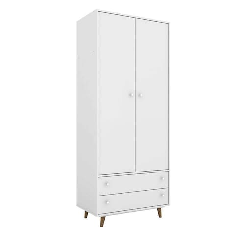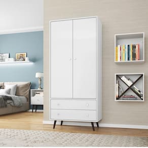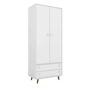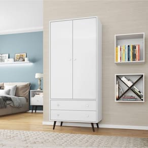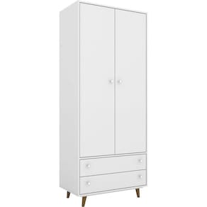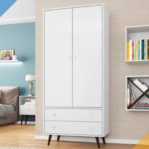 Elaborado em MDP com espessura de 15mm. Pintura da superfície em verniz poliéster brilhante, com secagem U.V. e impressão a laser. Acabamento de bordas com fitas de papel. Tubos-cabideiro de alumínio, corrediças metálicas, dobradiças metálicas, puxadores pontuais com acabamento cromado, pés tipo palito inclinados de madeira maciça.