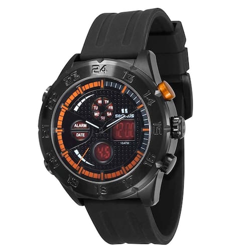 O Relógio Masculino Anadigi 20221, da Seculus, combina estilo com modernidade. Possui pulseira preta em silicone, caixa em aço, mostrador preto que atualiza os dias da semana/mês, possui alarme e fecho por fivela com pino.