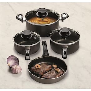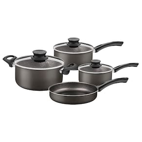 Prepare as refeições com muito mais praticidade e eficiência com o Conjunto de Panelas Tramontina Paris Texture! Ele inclui uma panela de 16cm (capacidade de 1,5L), uma panela de 18cm (2,1L), uma caçarola de 22cm (3,8L) e uma frigideira reta de 22cm (1,7L).