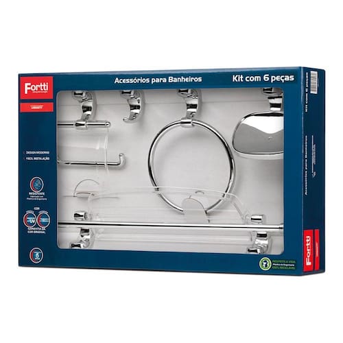 Esse kit facilita sua vida, pois de uma só vez você compra 6 itens. São eles: uma saboneteira, uma papeleira, um porta-shampoo, um toalheiro barra, um toalheiro argola e um cabide. Todos os acessórios são feitos de plástico de engenharia cromado, Material resistente que não enferruja. Eles equipam seu banheiro com qualidade e simplicidade.