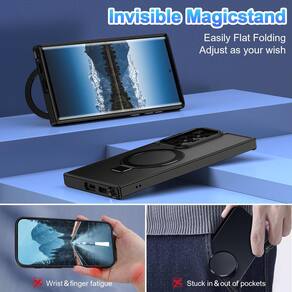 ?Suporte magnético invisível?Feito de alumínio de nível aeroespacial, o suporte é prático e multifuncional. Pode ser ajustada entre 40° e 120° para uma experiência de visualização estável e sem usar as mãos, e funciona como um suporte de anel para maior conveniência. Com estilo de vida N+1, pode ser utilizado para assistir TV, trabalhar em reuniões ou conversar por vídeo. - ?Modelos compatíveis? Esta capa fosca translúcida é compatível apenas com Samsung Galaxy S22 Ultra, não compatível com nenhum outro modelo de telefone. - ?Compatível com acessórios MagSafe e carregamento sem fio?Esta capa de telefone com um anel magnético integrado que se alinha perfeitamente com os carregadores MagSafe e outros carregadores com certificação Qi, oferece uma forte experiência de fixação e carregamento sem fio mais rápido. Compatível com todos os acessórios Magsafe, como um carregador magnético, suporte magnético para carro, carteira magnética, carregador magnético, etc. Carregue do seu jeito. - ?Design fosco translúcido?Parte traseira fosca translúcida avançada, restaurando a textura metálica e exibindo o logotipo do seu telefone fracamente, evita que a capa fique suja ou amarele, com uma sensação refrescante e suave. A textura fosca oferece uma melhor aderência. - ?Material premium?Feito de moldura de TPU flexível e parte traseira de policarbonato antiarranhões protege seu telefone contra choques e arranhões sem adicionar volume. - ?Suporte magnético invisível?Feito de alumínio de nível aeroespacial, o suporte é prático e multifuncional. Pode ser ajustada entre 40° e 120° para uma experiência de visualização estável e sem usar as mãos, e funciona como um suporte de anel para maior conveniência. Com estilo de vida N+1, pode ser utilizado para assistir TV, trabalhar em reuniões ou conversar por vídeo.
