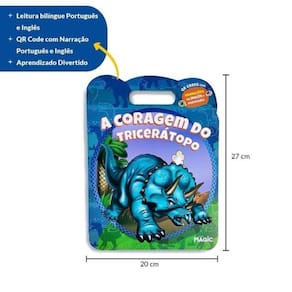 A Coragem do Tricerátopo é uma história incrível que leva os pequenos leitores a uma jornada divertida e educativa. Com ilustrações vibrantes e um formato cartonado com alça, este livro foi especialmente desenvolvido para facilitar o manuseio pelas mãos pequenas, tornando a leitura ainda mais divertida. A história é bilíngue, com textos em Português e Inglês, permitindo que as crianças aprendam dois idiomas de forma lúdica e interativa além disso o livro também conta com um QR Code que oferece narração da história, tanto em Português quanto em Inglês, proporcionando uma experiência imersiva e dinâmica. Com temas variados, a coleção Cartonado com Alça da Magic Kids, conta com histórias que estimulam a imaginação e o aprendizado, sendo perfeitas para leituras compartilhadas entre pais e filhos, oferecendo momentos de diversão e descobertas tornando-se essencial para incentivar o amor pela leitura desde cedo. Destaque Leitura bilíngue: Textos em Português e Inglês, ajudando no aprendizado de dois idiomas. Narração interativa: QR Code com narração em ambos os idiomas, proporcionando uma experiência rica e dinâmica. Aprendizado divertido: Histórias envolventes que estimulam a imaginação e o desenvolvimento linguístico das crianças.
