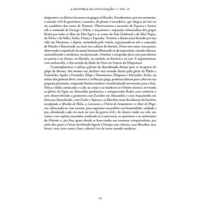 Durant traça o desenvolvimento histórico do \"grande organismo cultural grego\": de Creta e Troia até a conquista romana, descreve as condições materiais da existência grega, explica seus ritos e crenças, sua economia e moral, sem todavia perder de vista, neste amplo panorama, o particular, a vida de grandes personagens. A narrativa não se limita ao registro tipicamente factual, pois volta-se também para o surgimento e o florescimento da filosofia em suas múltiplas escolas, para a análise das artes plásticas e da literatura, para as odes de Píndaro e as tragédias de Ésquilo. Marca: Não Informado