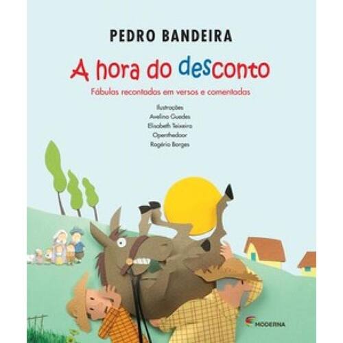 Em " A hora do desconto" , o leitor vai encontrar doze bons motivos para se divertir com as fá bulas recontadas em versos encharcados do humor irreverente que é a marca, nã o de uma lá grima, mas de muito riso, de Ped ro Bandeira. Das doze, cinco sã o de Esopo. " A corrente de amor" , de Jú lio Diniz " A roupa nova do rei" , de Hans Christian Andersen " Os trê s desejos" , dos irmã os Grimm " O rei e os sapatei ros" , de Bulhã o Pato " A casinha pequenina" , pará bola do Talmud e " A á rvore demorada" , de autor desconhecido. Se pelas suas contas ainda falta uma fá bulas, atento leitor, você está ce rto: trata-se de uma criada pelo pró prio Pedro Bandeira, que nã o ia deixar de pô r sua colher nesse caldeirã o milenar de fá bulas. Mas ainda há mais convidados: Avelino Guedes, Elizabeth Teixeira, Openthedoor e Rogé rio Borges, que també m puseram suas colheres, ou melhor, suas pinceladas de cores e leveza.