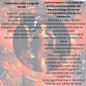 A Legítima Toalha Tecido Jogo Cartas Pomba Gira Luxo da Bialluz, é ótima para te auxiuliar durante o jogo de cartas, por ser um elemento que proporciona alta elevação enérgica. Você também pode usar para decorar seu altar, com certeza ficara ainda mais lindo e com muita energia positiva. Nossa toalha possui altíssima qualidade na impressão com pontos de brilho e é confeccionada em tecido oxford que não amassa e tem longa durabilidade.