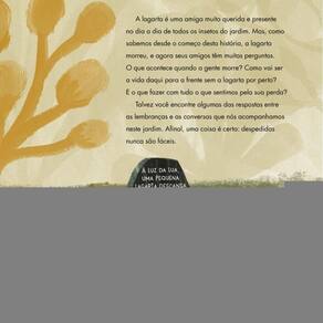 Com delicadeza, acolhimento e leveza, este é um livro que fala sobre um assunto para o qual dificilmente estamos preparados: a morte de alguém querido. A lagarta é uma amiga muito querida e presente no dia a dia de todos os insetos do jardim. Mas, como sabemos desde o começo desta história, a lagarta morreu, e agora seus amigos têm muitas perguntas. O que acontece quando a gente morre? Como vai ser a vida daqui para a frente, sem a lagarta por perto? E o que fazer com tudo o que eles sentem depois de sua perda? Os leitores podem encontrar algumas dessas respostas entre as lembranças e as conversas que os acompanham neste jardim. Com uma linguagem objetiva repleta de carisma e empatia, os autores deste livro propõem uma reflexão sobre o que é a morte — e como ela se relaciona com a vida, com a natureza e com os nossos sentimentos. Afinal, uma coisa é certa: despedidas não são fáceis, mas o acolhimento e o respeito às emoções fazem toda a diferença. Indicado para leitores a partir de 6 anos.