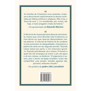 “A denúncia da riqueza perversa deve ser permanente, mesmo que, como diz São João Crisóstomo, os ricos ébrios em suas tavernas desconsiderem nossas palavras. O tribunal da história há de condenar os que promovem as desigualdades. Impressiona a palavra do santo em seu segundo sermão: ‘Quando Lázaro estava por perto, o rico costumava ignorá-lo. Quando está distante, ele o chama. O homem a quem ele não enxergava ao entrar e sair, ele agora o vê com clareza, na distância.’ O julgamento é severo, pois o doutor da Igreja considera ‘roubo não compartilhar suas posses’; atitudes egoístas são, portanto, embuste e fraude.” – Do prefácio de padre Júlio Lancellotti