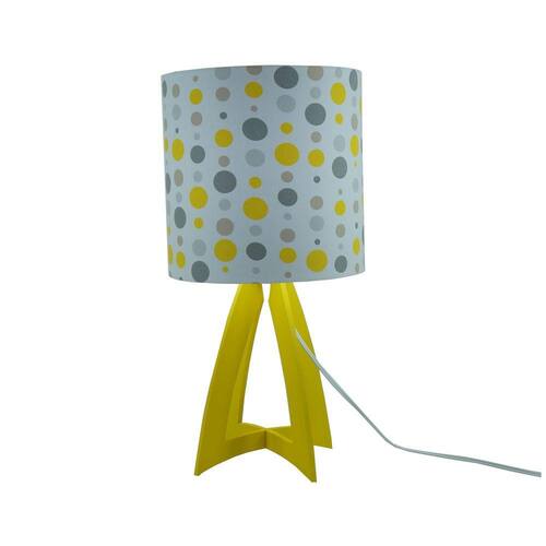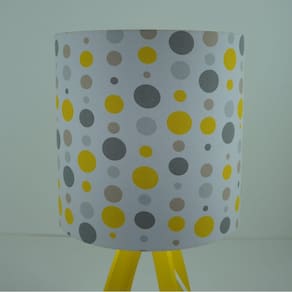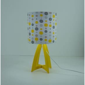 Abajur com base em madeira na cor amarela. Cúpula revestida com tecido estampado poás nas cores amarelo e cinza. Cúpula medindo 20 cm de diâmetro x 20 cm de altura. Dimensões do produto: Altura: 40 cm Largura: 20 cm. Bivolt. Usar lâmpadas fluorescentes ou LED até 25 w. Fio e plug liga/desliga na cor branca.