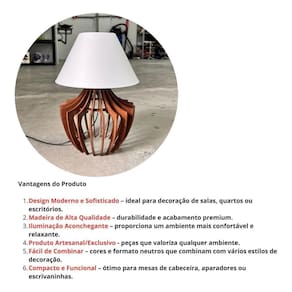 ATENÇÃO NÃO ACOMPANHA LAMPADA Características do Produto: Material: Madeira de alta qualidade Design: Moderno e minimalista Iluminação: Suave e aconchegante Ideal para: Mesas de cabeceira, aparadores, estantes ou escrivaninhas Compatível com lâmpadas LED ou comuns soquete padrão E27 Tamanho Altura: 32cm Diâmetro: 22cm Vantagens para você: Produto com acabamento premium Peça versátil que combina com vários estilos de troca em caso de defeito de fabricação Marca: Não Informado Ean: 7897209147086
