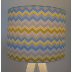 Abajur com base em madeira na cor branca e cúpula revestida com tecido estampado chevron colorido. Cúpula medindo 20 cm de diâmetro x 15 cm de altura. Dimensões do produto: Altura: 35 cm Largura: 20 cm. Bivolt. Usar lâmpadas fluorescentes ou LED até 25 w.