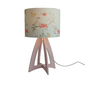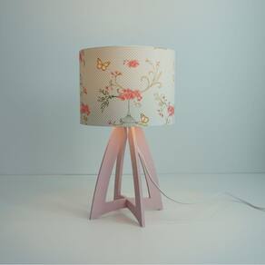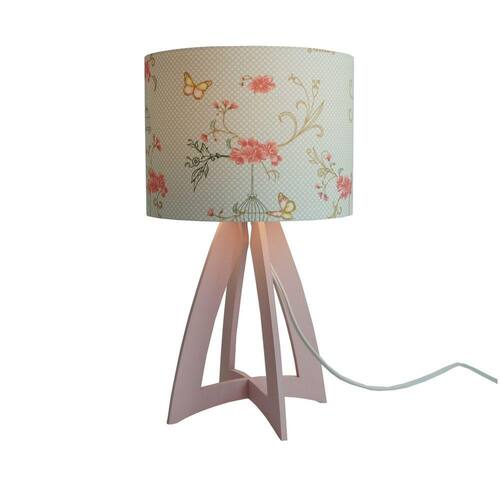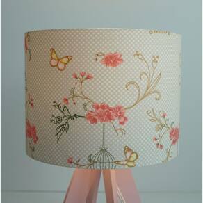 Abajur com base em madeira na cor rosa e cúpula revestida com tecido estampado gaiolas e borboletas Vanessa Guimarães na cor malva. Cúpula medindo 20 cm de diâmetro x 15 cm de altura. Dimensões do produto: Altura: 35 cm Largura: 20 cm. Bivolt. Usar lâmpadas fluorescentes ou LED. Fio branco com plug liga e desliga. Fio com 1,7 metros.