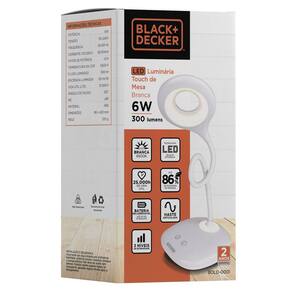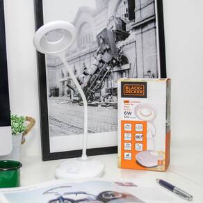 Luminária de mesa Black & Decker, 6W em Led, Bivolt 100-240V . - Cor do abajur: Branco. - Tripla função: Abajur de mesa, luz noturna e iluminação de emergência. - Possui 3 intensidades de luz e ainda a luz noturna. - Luz branca, 6500K, gera 300 lumens. - Cabo USB. - Pode ficar por até 2h fora da tomada em funcionamento! luz de emergência! . - 2 anos de garantia. - Totalmente flexível. - Material em ABS. - Tem a garantia de qualidade Black & Decker. Pode confiar! Ean: 7898638302367