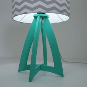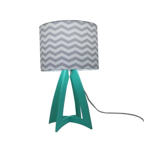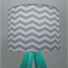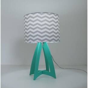 Abajur com base em madeira na cor verde menta e cúpula revestida com tecido chevron cinza e branco.