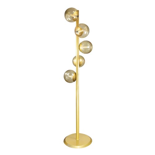 Descrição Técnica: - Modelo: Figo - Acabamento da Base e Tubo: Pintura a pó eletrostática - Vidro: Branco - Material: Alumínio e Vidro - Quant. soquetes: 5 - Tamanho: Base 29 cm de diâmetro - Altura total 155 cm - Cabo: 3 m paralelo preto - Soquete: Padrão G9 - Interruptor piso: Sim - Bivolt: Sim - Flecha (Tomada): Padrão Brasil