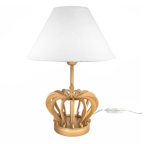 Este belo abajur de madeira é peça obrigatória na decoração de quartos infantis, que tenham estilo e bom gosto. Perfeito para ornamentar e proporcionar um efeito luminoso, que vai embalar o sono aconchegante dos pequenos Dados TécnicosAbajur com base de madeira dourada decorado com coroa e cúpula forrada com tecido. Lâmpadas SuportadasEconômicas/ LED: Qualquer LâmpadaIncandescente amarela : Até 40w por Soquete Medidas do AbajurDiâmetro da base: 17 cmAltura: 25 cm Medidas da CúpulaDiâmetro da Parte Debaixo: 20 cmDiâmetro da Parte de Cima: 8 cmAltura: 13 cmAltura Total: 35 cm