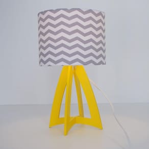 Abajur com base em madeira na cor amarela e cúpula revestida com tecido estampado chevron nas cores cinza e branco. Cúpula medindo 20 cm de diâmetro x 15 cm de altura. Dimensões do produto: Altura: 35 cm Largura: 20 cm. Bivolt. Usar lâmpadas fluorescentes ou LED. Fio branco com plug liga desliga. Fio com 1,7 metros.