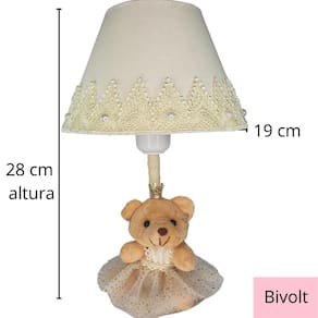 Este abajur é bivolt, podendo ser utilizado tanto em voltagem de 110V quanto de 220V. No entanto, a lâmpada não está inclusa, sendo necessário utilizar uma lâmpada de no máximo 40W. O abajur vem acompanhado de um urso na base, tornando-o ainda mais encantador.