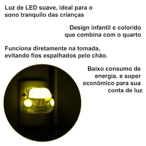========== sobre o produto ========== O abajur de tomada infantil em formato de carro é o complemento perfeito para o quarto do seu filho, proporcionando uma luz suave e reconfortante durante a noite. Equipado com leds de baixa potência, este abajur consome pouca energia e oferece uma iluminação suave que não perturba o sono. Além disso, sua construção em forma de nuvem adiciona um toque encantador à decoração do quarto. Com um design compacto e seguro para uso em tomadas, este abajur é uma escolha ideal para criar um ambiente tranquilo e relaxante para seu filho durante a noite. ========== especificações ========== Os leds de baixa potência oferecem uma luz suave e reconfortante que não perturba o sono. Design em forma de carro que adiciona um toque encantador à decoração do quarto. Consumo de energia eficiente para uso contínuo durante a noite. ========== ficha técnica ========== Medidas: 10 x 7cm Material: polipropileno e metal Potência: bivolt Marca: art house : 3 meses Estamos online para quaisquer dúvidas. Agradecemos e aguardamos o seu pedido.
