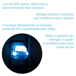 ========== sobre o produto ========== O abajur de tomada infantil em formato de carro é o complemento perfeito para o quarto do seu filho, proporcionando uma luz suave e reconfortante durante a noite. Equipado com leds de baixa potência, este abajur consome pouca energia e oferece uma iluminação suave que não perturba o sono. Além disso, sua construção em forma de nuvem adiciona um toque encantador à decoração do quarto. Com um design compacto e seguro para uso em tomadas, este abajur é uma escolha ideal para criar um ambiente tranquilo e relaxante para seu filho durante a noite. ========== especificações ========== Os leds de baixa potência oferecem uma luz suave e reconfortante que não perturba o sono. Design em forma de carro que adiciona um toque encantador à decoração do quarto. Consumo de energia eficiente para uso contínuo durante a noite. ========== ficha técnica ========== Medidas: 10 x 7cm Material: polipropileno e metal Potência: bivolt Marca: art house : 3 meses Estamos online para quaisquer dúvidas. Agradecemos e aguardamos o seu pedido. Ean: 7899141299540
