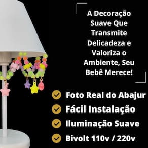 - cúpula de polipropileno plástico resistente na cor branco; - base em acrílico branco; - haste de acrílico branco; - pingentes de estrelas, balinhas, bolinhas neon; - altura total do abajur 30 cm; - diâmetro maior da cúpula mede 17 cm; - soquete para lâmpadas modelo e-27 bivolt aceita lâmpadas 110v e 220v ; - usar lâmpada de no máximo 40w lâmpada não incluso ; - importante: imagens reais do produto, porém as cores dos pingentes e pérolas podem variar de acordo com cada produto fabricado, conforme disponibilidade Do estoque