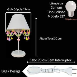 - cúpula de polipropileno plástico resistente na cor branco; - base em acrílico branco; - haste de acrílico branco; - pingentes de estrelas, balinhas, bolinhas neon; - altura total do abajur 30 cm; - diâmetro maior da cúpula mede 17 cm; - soquete para lâmpadas modelo e-27 bivolt aceita lâmpadas 110v e 220v ; - usar lâmpada de no máximo 40w lâmpada não incluso ; - importante: imagens reais do produto, porém as cores dos pingentes e pérolas podem variar de acordo com cada produto fabricado, conforme disponibilidade Do estoque