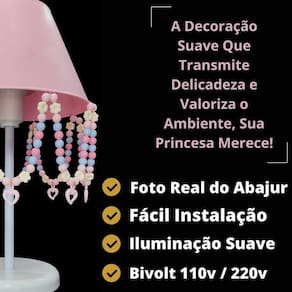 - cúpula de polipropileno plástico resistente na cor rosa bebê; - base em acrílico branco; - haste de acrílico branco; - pingentes de coração, pérolas coloridas, flores; - altura total do abajur 30 cm; - diâmetro maior da cúpula mede 17 cm; - soquete para lâmpadas modelo e-27 bivolt aceita lâmpadas 110v e 220v ; - usar lâmpada de no máximo 40w lâmpada não incluso ; - importante: imagens reais do produto, porém as cores dos pingentes e pérolas podem variar de acordo com cada produto fabricado, conforme disponibilidade Do estoque