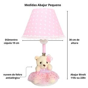 Transforme o quartinho do seu bebê em um verdadeiro reino de ternura com este lindo abajur Ursa Princesa Com um design delicado e encantador, ele combina perfeitamente com decorações nos temas Ursinha, Realeza ou Princesa, criando um ambiente aconchegante e acolhedor. Ideal para mesas de apoio, cômodas dentre outros, o abajur proporciona uma iluminação suave, perfeita para momentos de amamentação, troca de fraldas ou para deixar o bebê mais tranquilo durante a noite. Destaques do Produto: Modelo: Ursa Princesa com coroa dourada Iluminação suave, ideal para o quarto do bebê Base estável e estrutura resistente Acabamento delicado e artesanal Combina com diversos temas infantis Ótima opção de presente para chá de bebê, nascimento ou batizado Especificações Técnicas: Voltagem: 110V/220V ou bivolt Tipo de lâmpada: ex: LED ou incandescente - não inclusa Material: MDF, tecido Lindo abajur infantil em tecido com um ursinha na base para o quarto do bebê ou criança, ideal para deixar o ambiente com funcionalidade e muito mais charme e beleza. O abajur é ideal para proporcionar uma luz suave e reconfortante durante a noite, ajudando as crianças a se sentirem mais seguras e tranquilas enquanto dormem. O abajur infantil vai deixar o quarto pronto para a chegada do bebê em casa O abajur infantil e para bebês é uma ótima opção para adicionar um toque aconchegante e alegre ao quarto dos pequenos. Onde usar: Poderá ser colocado na cômoda ou mesa Contém:1 Abajur - com iluminação suave, ajuda as mamães a cuidar do bebê à noite. Composição: Abajur com cúpula de polipropileno plástico , revestido por tecido 100% algodão. Base de madeira revestida de tecido Metragem: Abajur 30cm altura Cúpula 10cm x 18cm Bivolt: 110V ou 220V Lâmpada: usar de no máximo 40W não inclusa lâmpada de bolinha Tamanho fio 90 cm com liga / desliga Conteúdo da embalagem: 1 abajur com urso na base Limpeza: Basta limpar com espanador ou pano seco. Marca: Não Informado Ean: 7898704681730