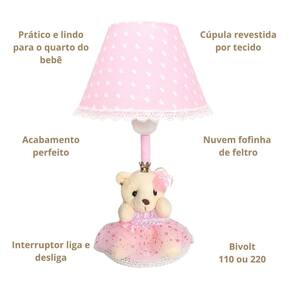 Transforme o quartinho do seu bebê em um verdadeiro reino de ternura com este lindo abajur Ursa Princesa Com um design delicado e encantador, ele combina perfeitamente com decorações nos temas Ursinha, Realeza ou Princesa, criando um ambiente aconchegante e acolhedor. Ideal para mesas de apoio, cômodas dentre outros, o abajur proporciona uma iluminação suave, perfeita para momentos de amamentação, troca de fraldas ou para deixar o bebê mais tranquilo durante a noite. Destaques do Produto: Modelo: Ursa Princesa com coroa dourada Iluminação suave, ideal para o quarto do bebê Base estável e estrutura resistente Acabamento delicado e artesanal Combina com diversos temas infantis Ótima opção de presente para chá de bebê, nascimento ou batizado Especificações Técnicas: Voltagem: 110V/220V ou bivolt Tipo de lâmpada: ex: LED ou incandescente - não inclusa Material: MDF, tecido Lindo abajur infantil em tecido com um ursinha na base para o quarto do bebê ou criança, ideal para deixar o ambiente com funcionalidade e muito mais charme e beleza. O abajur é ideal para proporcionar uma luz suave e reconfortante durante a noite, ajudando as crianças a se sentirem mais seguras e tranquilas enquanto dormem. O abajur infantil vai deixar o quarto pronto para a chegada do bebê em casa O abajur infantil e para bebês é uma ótima opção para adicionar um toque aconchegante e alegre ao quarto dos pequenos. Onde usar: Poderá ser colocado na cômoda ou mesa Contém:1 Abajur - com iluminação suave, ajuda as mamães a cuidar do bebê à noite. Composição: Abajur com cúpula de polipropileno plástico , revestido por tecido 100% algodão. Base de madeira revestida de tecido Metragem: Abajur 30cm altura Cúpula 10cm x 18cm Bivolt: 110V ou 220V Lâmpada: usar de no máximo 40W não inclusa lâmpada de bolinha Tamanho fio 90 cm com liga / desliga Conteúdo da embalagem: 1 abajur com urso na base Limpeza: Basta limpar com espanador ou pano seco. Marca: Não Informado