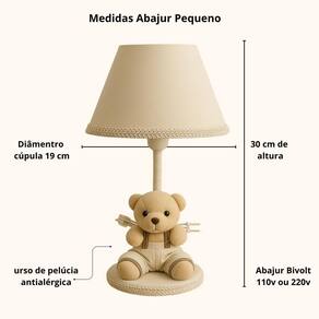 Transforme o quartinho do seu bebê em um verdadeiro reino de ternura com este lindo abajur Urso na cor Bege. Com um design delicado e encantador, ele combina perfeitamente com decorações nos temas Ursinho, Balão ou Nuvens, criando um ambiente aconchegante e acolhedor. Ideal para mesas de apoio e cômodas, o abajur proporciona uma iluminação suave, perfeita para momentos de amamentação, troca de fraldas ou para deixar o bebê mais tranquilo durante a noite. Destaques do Produto: Modelo: Urso Iluminação suave, ideal para o quarto do bebê Base estável e estrutura resistente Acabamento delicado e artesanal Combina com diversos temas infantis Ótima opção de presente para chá de bebê, nascimento ou batizado Especificações Técnicas: Voltagem: 110V/220V ou bivolt Tipo de lâmpada: ex: LED ou incandescente - não inclusa Material: MDF, tecido Lindo abajur infantil em tecido com um ursinho na base para o quarto do bebê ou criança, ideal para deixar o ambiente com funcionalidade e muito mais charme e beleza. O abajur é ideal para proporcionar uma luz suave e reconfortante durante a noite, ajudando as crianças a se sentirem mais seguras e tranquilas enquanto dormem. O abajur infantil vai deixar o quarto pronto para a chegada do bebê em casa O abajur infantil e para bebês é uma ótima opção para adicionar um toque aconchegante e alegre ao quarto dos pequenos. Onde usar: Poderá ser colocado na cômoda ou mesa Contém:1 Abajur - com iluminação suave, ajuda as mamães a cuidar do bebê à noite. Composição: Abajur com cúpula de polipropileno plástico , revestido por tecido 100% algodão. Base de madeira revestida de tecido Metragem: Abajur 30cm altura Cúpula 10cm x 18cm Bivolt: 110V ou 220V Lâmpada: usar de no máximo 40W não inclusa lâmpada de bolinha Tamanho fio 90 cm com liga / desliga Conteúdo da embalagem: 1 abajur com urso na base Limpeza: Basta limpar com espanador ou pano seco. Marca: Não Informado Ean: 7898704681716
