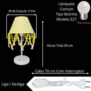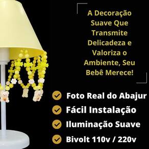 Artesanal, design moderno, ideal para decoração de quarto de crianças, bebê, ilumina muito bem e realça o ambiente. Especificações abajur: - cúpula de polipropileno plástico resistente na cor amarelo; - base em acrílico branco; - haste de acrílico branco; - pingentes de urso, pérolas amarelas, balinhas, flores; - altura total do abajur 30 cm; - diâmetro maior da cúpula mede 17 cm; - soquete para lâmpadas modelo e-27 bivolt aceita lâmpadas 110v e 220v ; - usar lâmpada de no máximo 40w lâmpada não incluso ; - importante: imagens reais do produto, porém as cores dos pingentes e pérolas podem variar de acordo com cada produto fabricado, conforme disponibilidade Do atenção mamãe grande por tempo limitado Marca: Não Informado