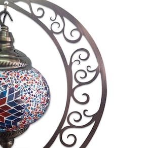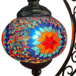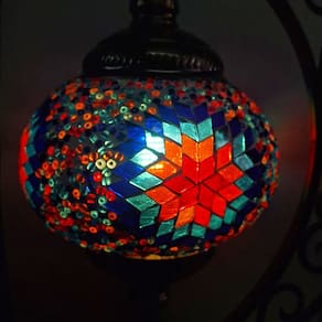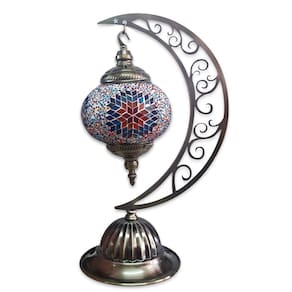 Lindo Abajur de mesa decorativo Turco, com suporte de metal bronzeado e cúpula circular artesanal em mosaico de vidros.